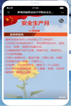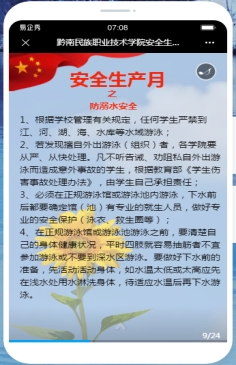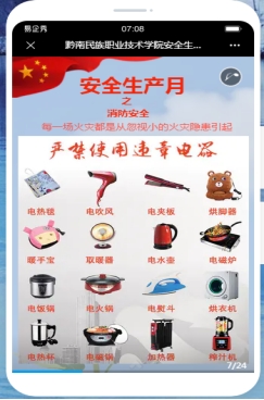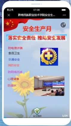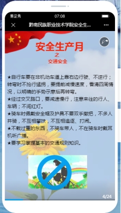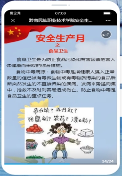 为深入学习习近平总书记关于安全生产重要论述,强化领导干部“人民至上、生命至上”理念,更好统筹发展和安全,切实把安全责任扛在肩上、落在行动上,以实际行动和实际效果做到“两个维护”。深化“落实安全责任 推动安全发展”主题,帮助师生丰富安全常识,增强隐患意识,提升避险能力,全面推进安全发展理念进校园。结合现阶段疫情防控要求,学院于6月16--25日开展了线上“安全宣传咨询日”活动。活动内容包括:观看《生命重于泰山》专题纪录片;学习《安全生产法》、《贵州省安全生产条例》、《黔南州党政领导干部安全生产责任制实施办法》;各系组织学生学习防范性侵、大学生用电安全常识、大学防骗小常识、防溺水安全知识、火灾逃生自救知识、道路交通事故应急知识;使用手机观看《黔南职院“安全生产月”宣传微视频》。