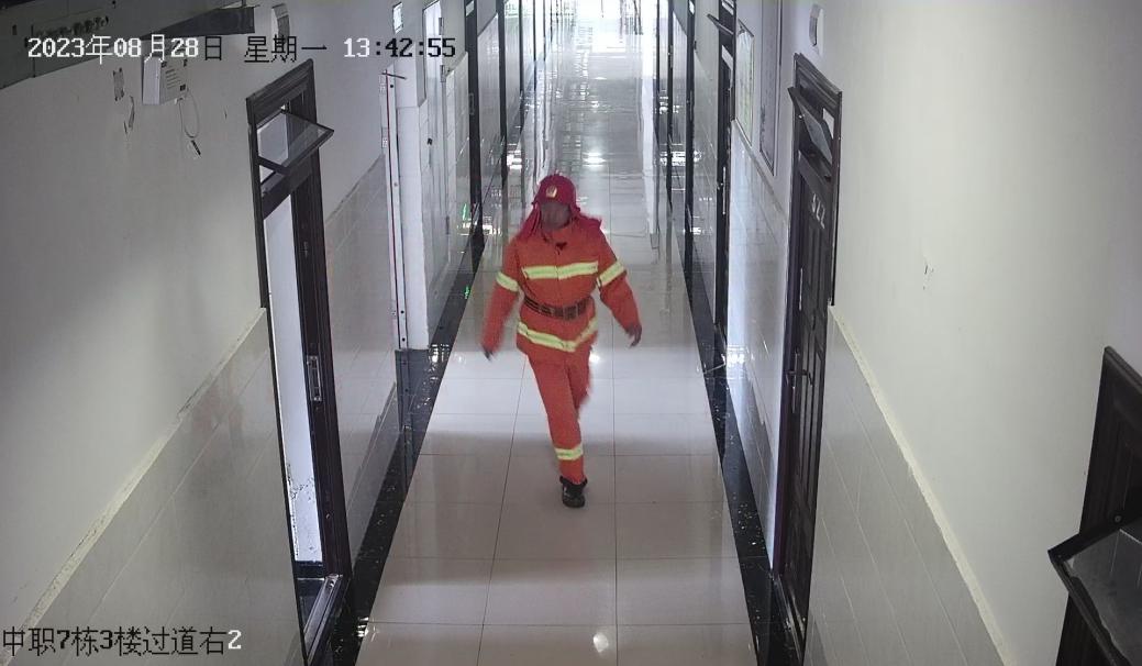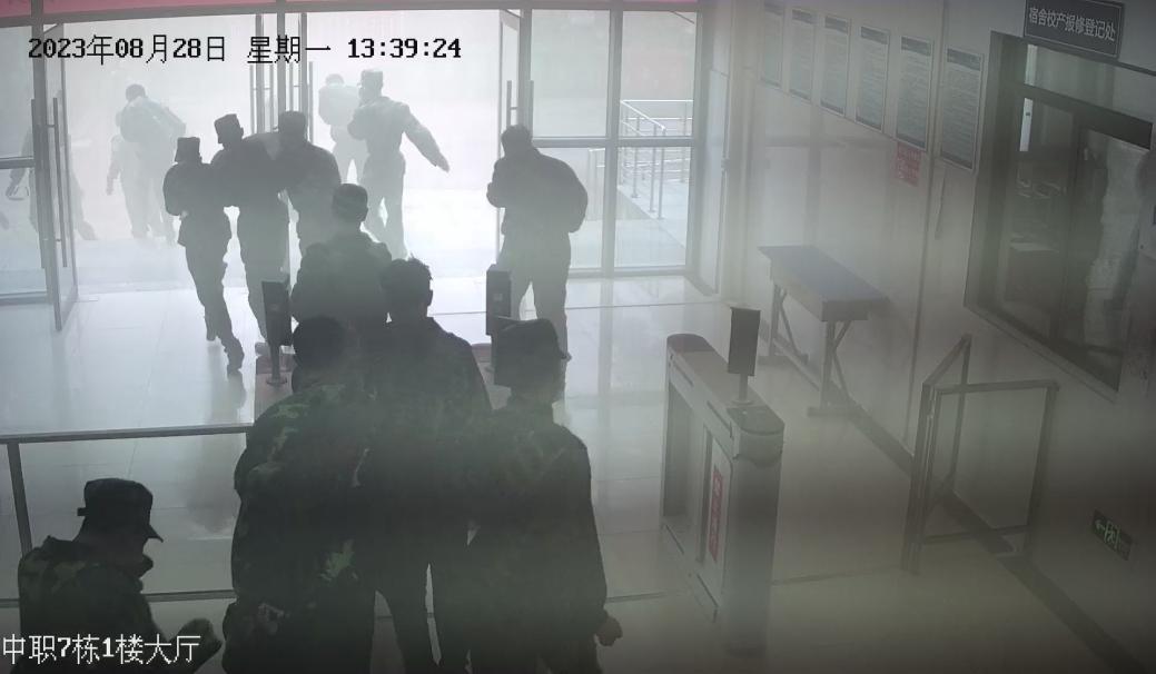 8月28日13:40,应急疏散演练指挥部(监控中心)接到7、8号宿舍楼火灾报警后,立即启动了消防应急疏散预案。正在午休的新生在老师和安保人员的引导下,有序疏散到北区运动场集合。疏散过程中没有发生摔倒、踩踏等现象。整个疏散、搜救过程耗时6分半钟。