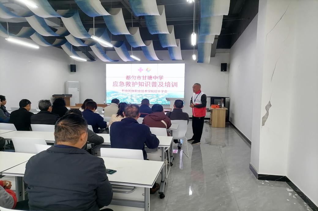 根据学院中高职协同急救教育基地的工作计划,结合周边甘塘中学的实际需要,2024年11月22日,学院红十字志愿队为都匀市甘塘中学校长陆化林带队的38名教师举办了一场应急救护知识培训。