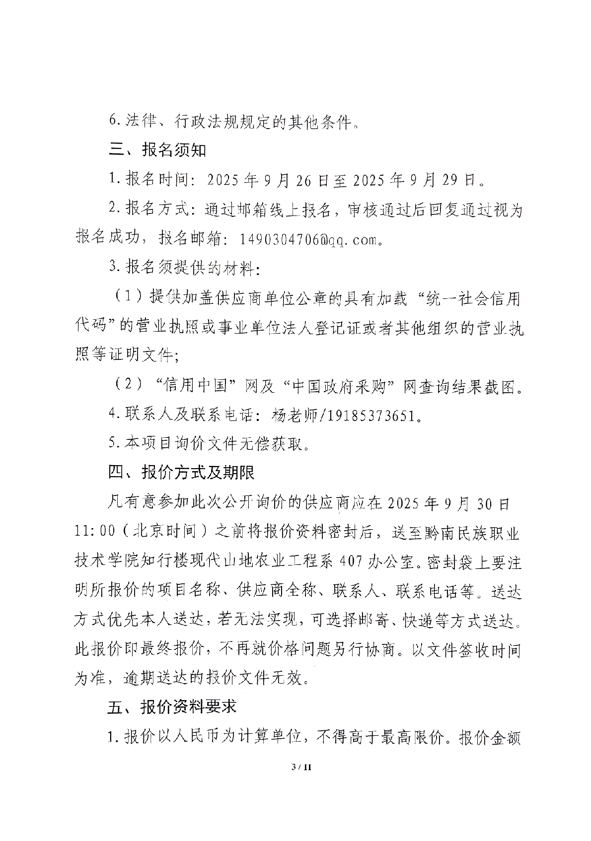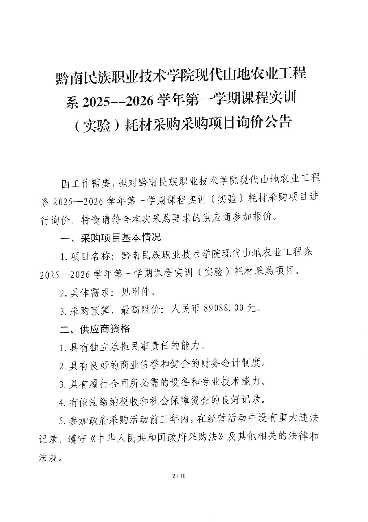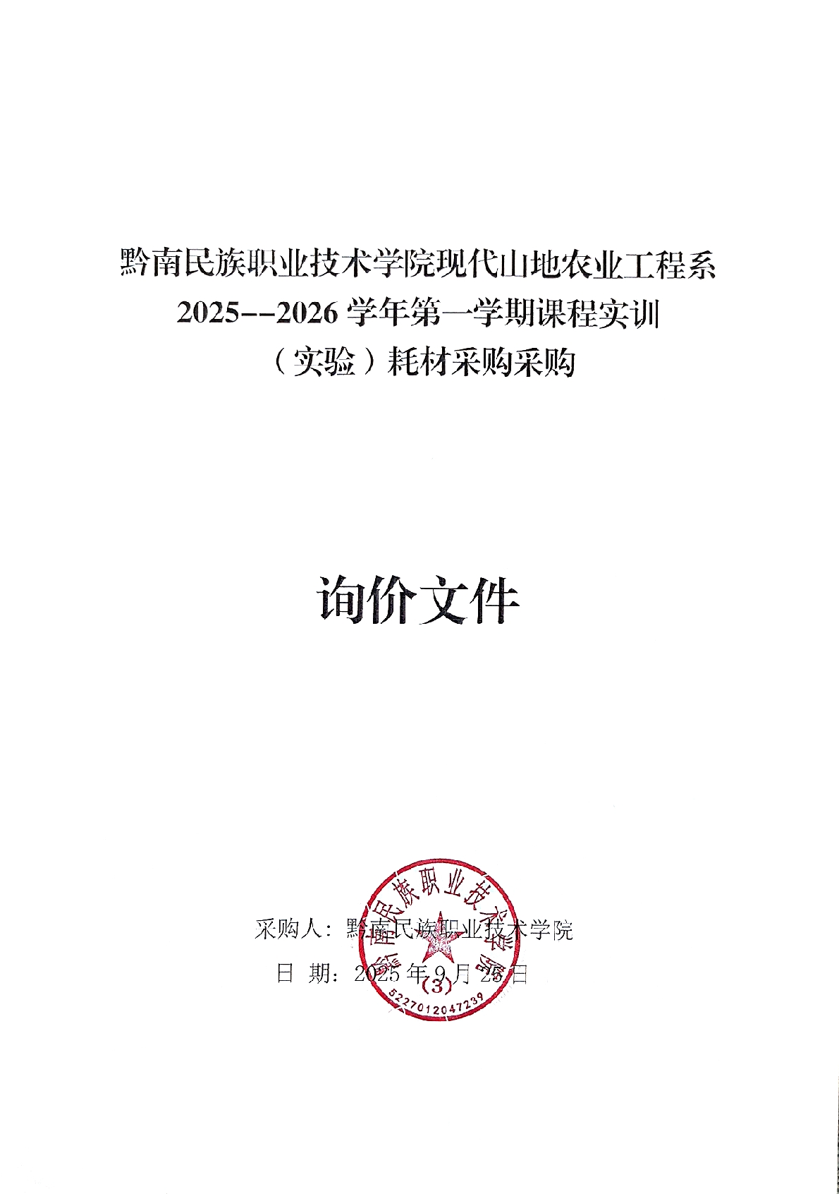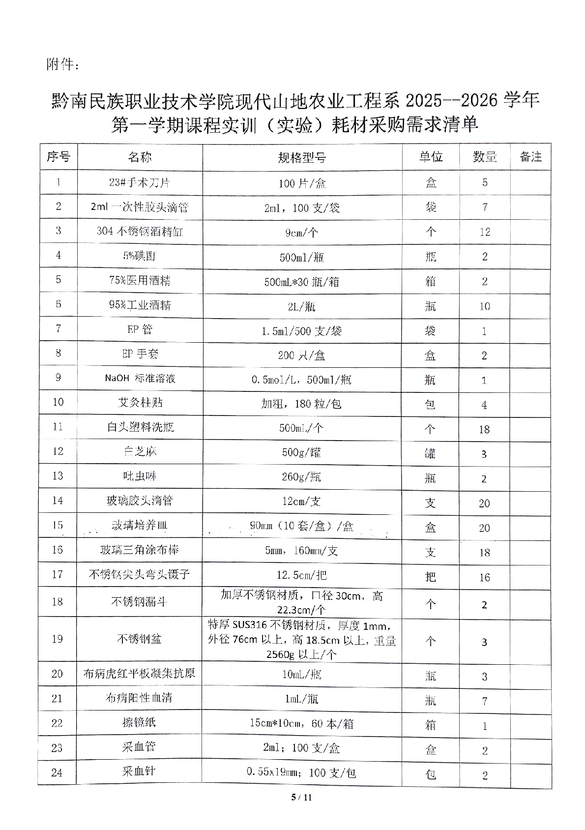 黔南民族职业技术学院现代山地农业工程系2025-2026 学年第一学期课程实训(实验)耗材采购采购