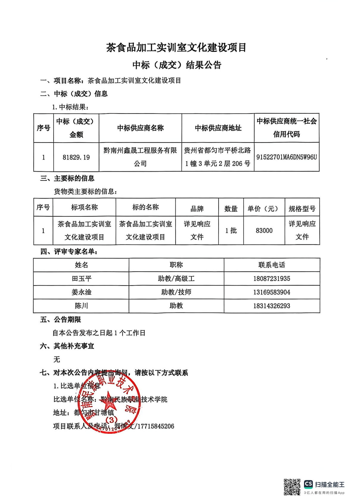 茶食品加工实训室文化建设项目项目项目中标(成交)结果公告