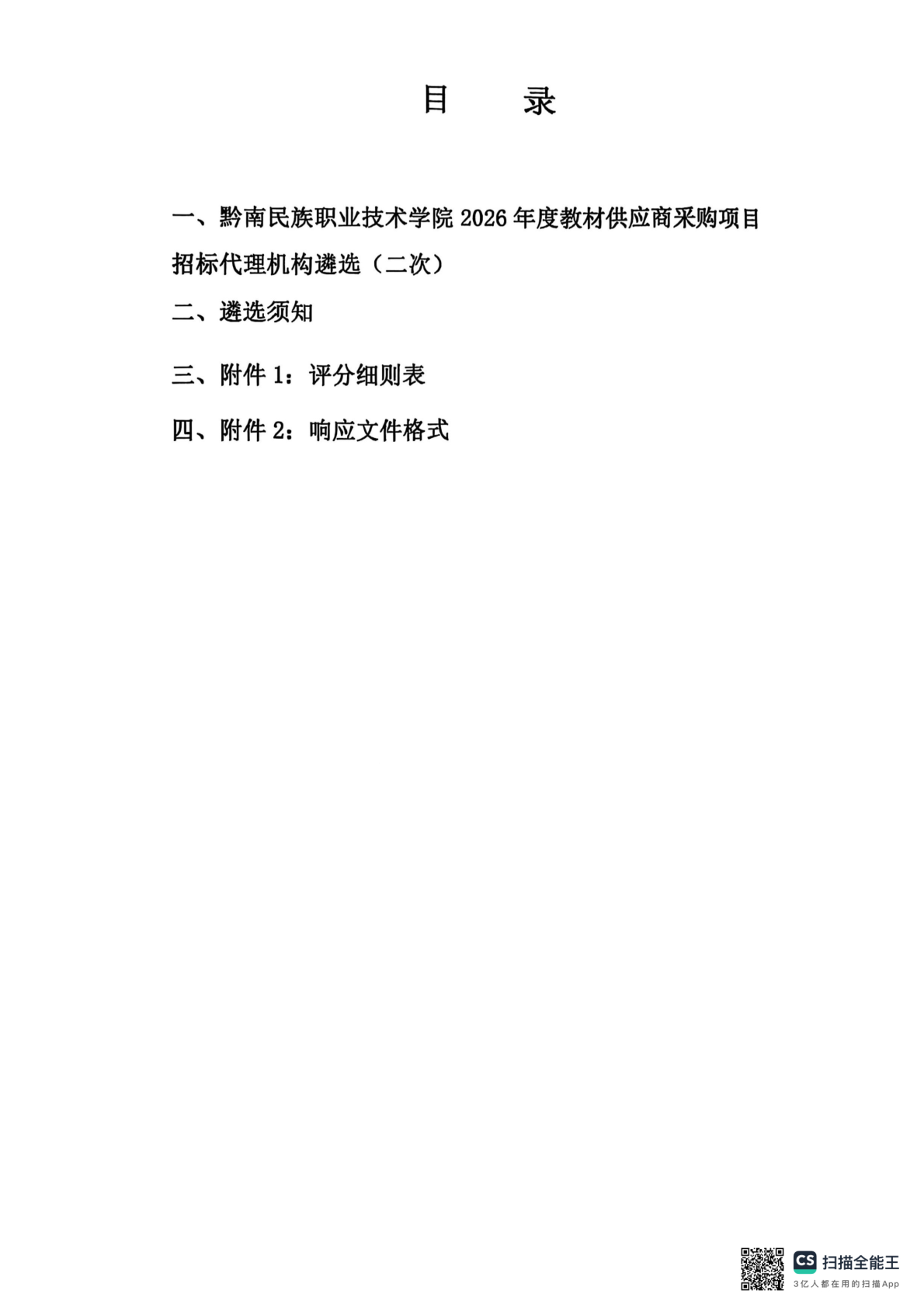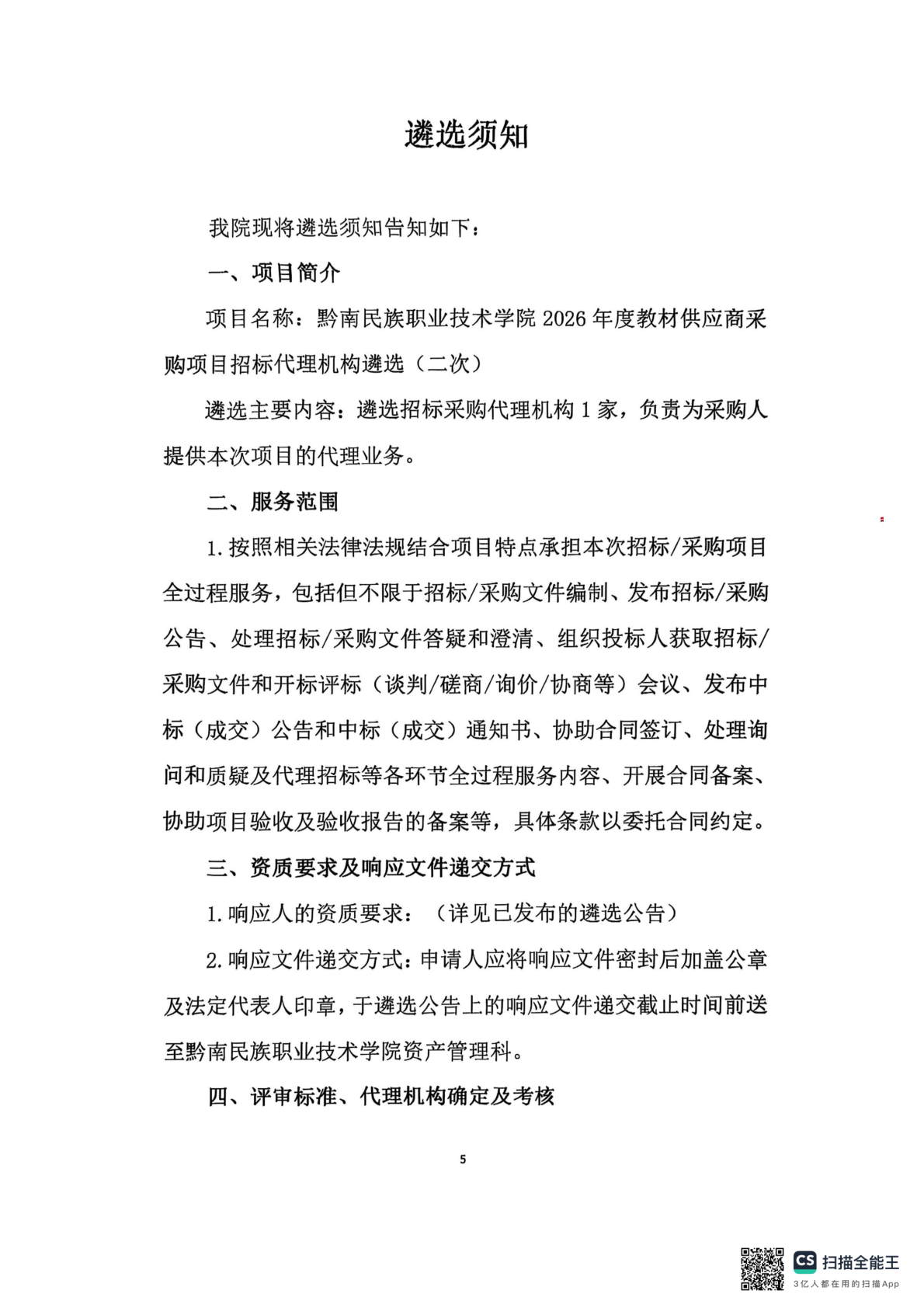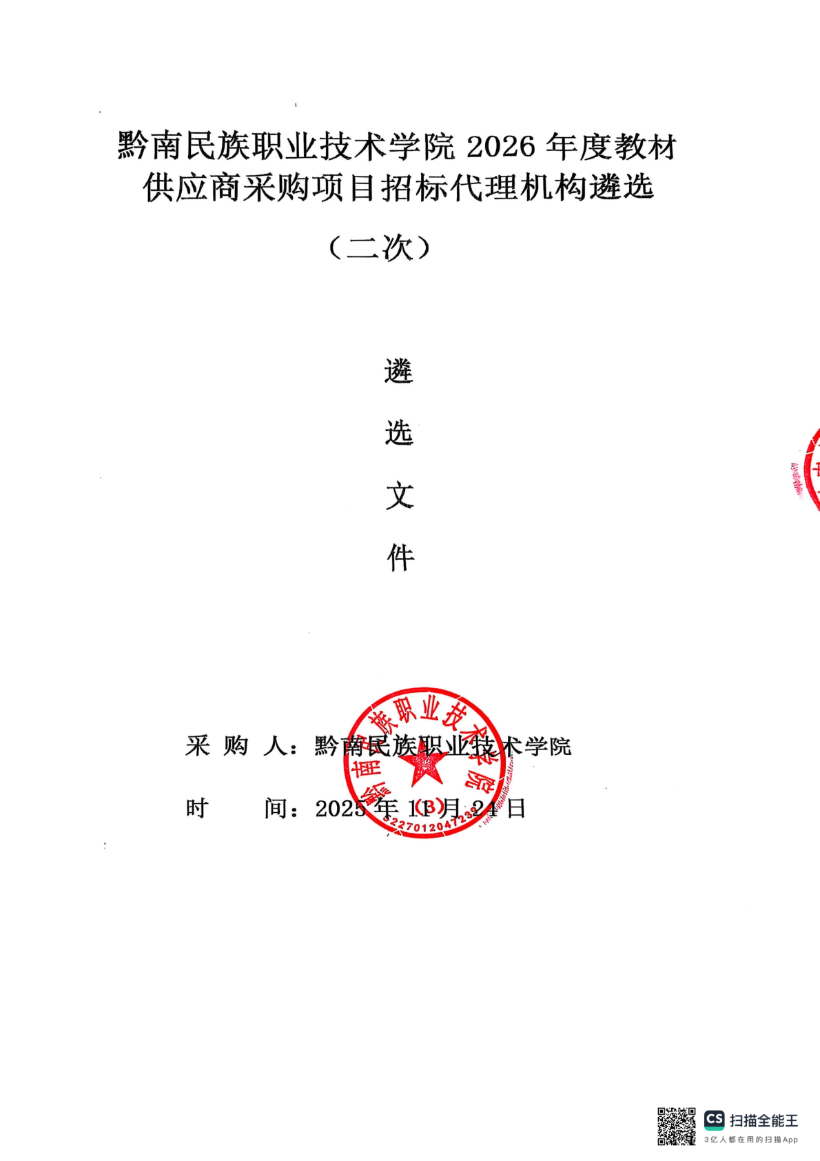 黔南民族职业技术学院2026年度教材供应商采购项目招标代理机构遴选(二次)遴 选 文 件