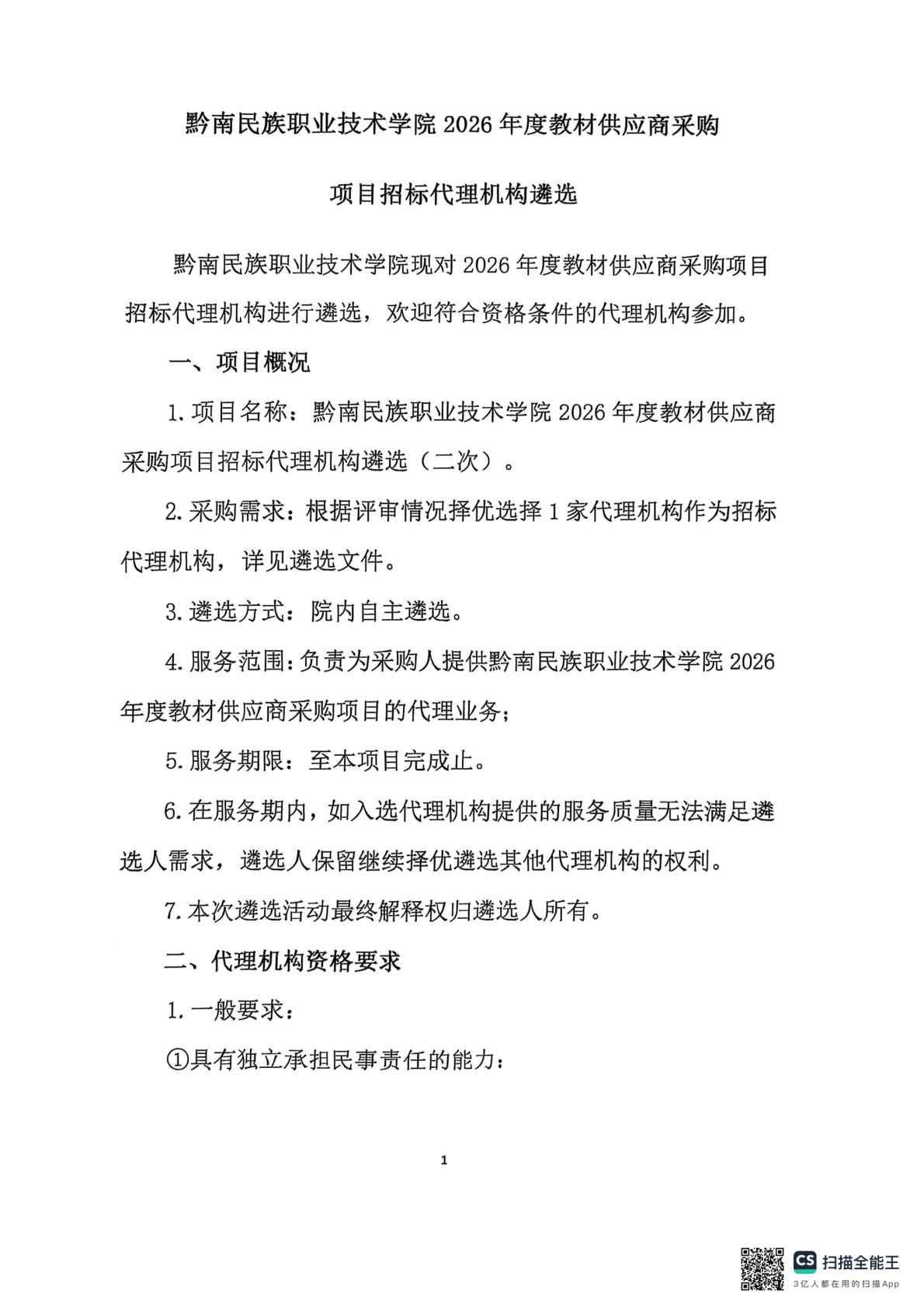 黔南民族职业技术学院2026年度教材供应商采购招标代理机构遴选(二次).docx