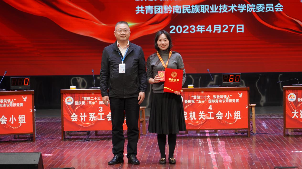 活动中,刘荣鹏院长为荣获贵州省“最美劳动者”荣誉称号的赵一瑾老师颁奖。