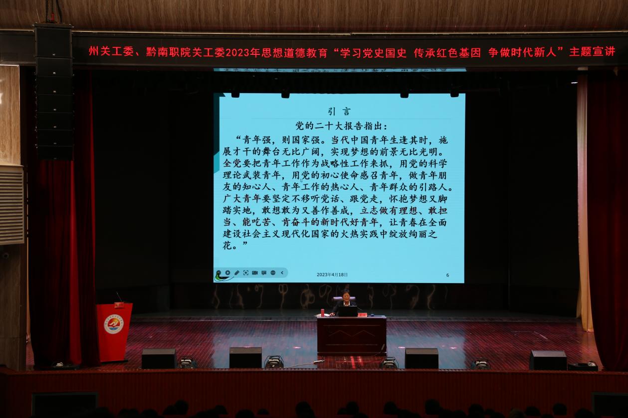 为深入学习贯彻党的二十大精神,推进习近平新时代中国特色社会主义思想“三进”工作,引导广大师生听党话、跟党走、感党恩,着力培养有理想、敢担当、能吃苦、肯奋斗的时代新人,4月18日下午,州关工委思想道德教育“学习党史国史 传承红色基因 争做时代新人”主题教育活动系列讲座第二期主题宣讲在学院同心厅举行。州关工委常务副主任丁匀出席并指导,州关工委副主任夏平主讲。宣讲会由组织部副部长孔育生主持。学院党委领导、师生代表300余人到场聆听讲座。