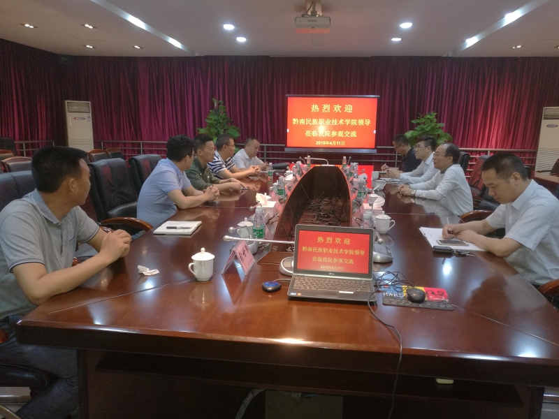 贺定修院长向考察组介绍了东莞职院近年来的发展情况,特别是在内涵建设、科研工作上成绩斐然,在国家和广东省高职院校排名中都名列前位。饶辉院长向东莞职院领导介绍了我院发展情况,认为东莞职业技术学院的发展成绩突出,对黔南职院的发展有重要借鉴意义,感谢东莞职院贺院长等领导对我校发展的关心与支持,希望今后两校在专业建设、干部挂职锻炼、科研工作等方面开展深度交流与合作。贺定修院长在听完饶辉院长的讲话后,表示东莞职院可根据自己的做法和经验,尽力帮助黔南职院争创省级优质高职院校,今年暑假亲自带队到黔南职院开设讲座,帮助干部教师提高创优意识,提高迎检工作质量。